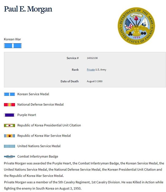 Private Paul E. Morgan US Army 5th Cavalry Regiment Infantry 1st Cavalry Division Infantry. The 1st Cavalry Division was rushed from Japan to Korea to help shore up the Pusan Perimeter, soon after daylight in the early morning of 18 July 1950, succeeded in carrying out the first amphibious landing of the Korean War. The first troops of the 5th Cavalry Regiment came ashore that afternoon. At noon on 19 July 1950, General Gay assumed command ashore and the 5th Cavalry started toward Taejon. Pvt Morgan was killed in action on 3 August 1950 in the vicinity of Taejon, South Korea. He was buried in a temporary grave until 1951 when his remains were repatriated to America and reinterred in the Knoxville National Cemetery at Knoxville, Knox County, Tennessee on Thursday 16 August 1951.