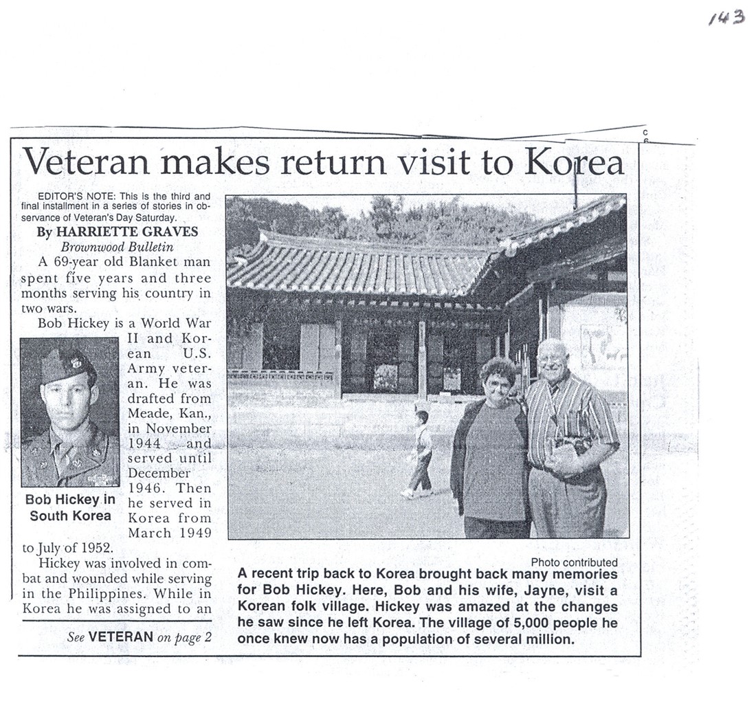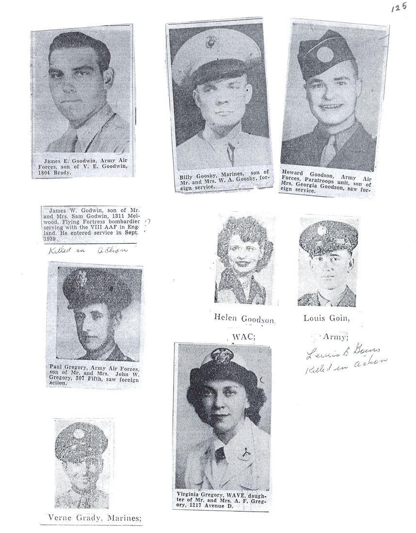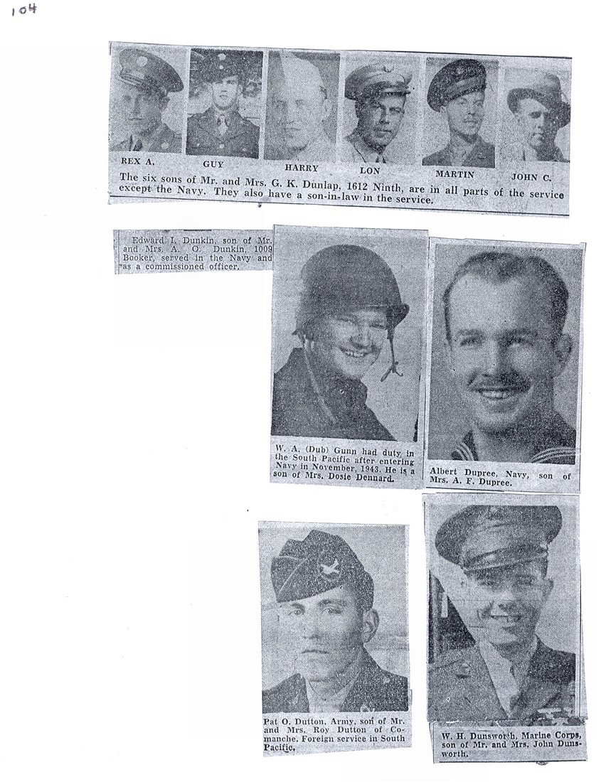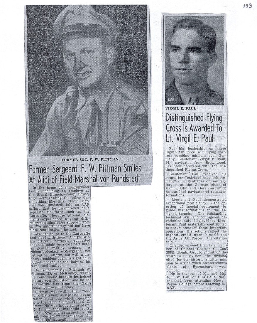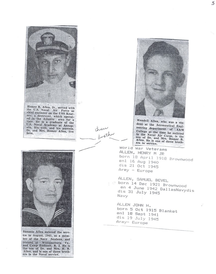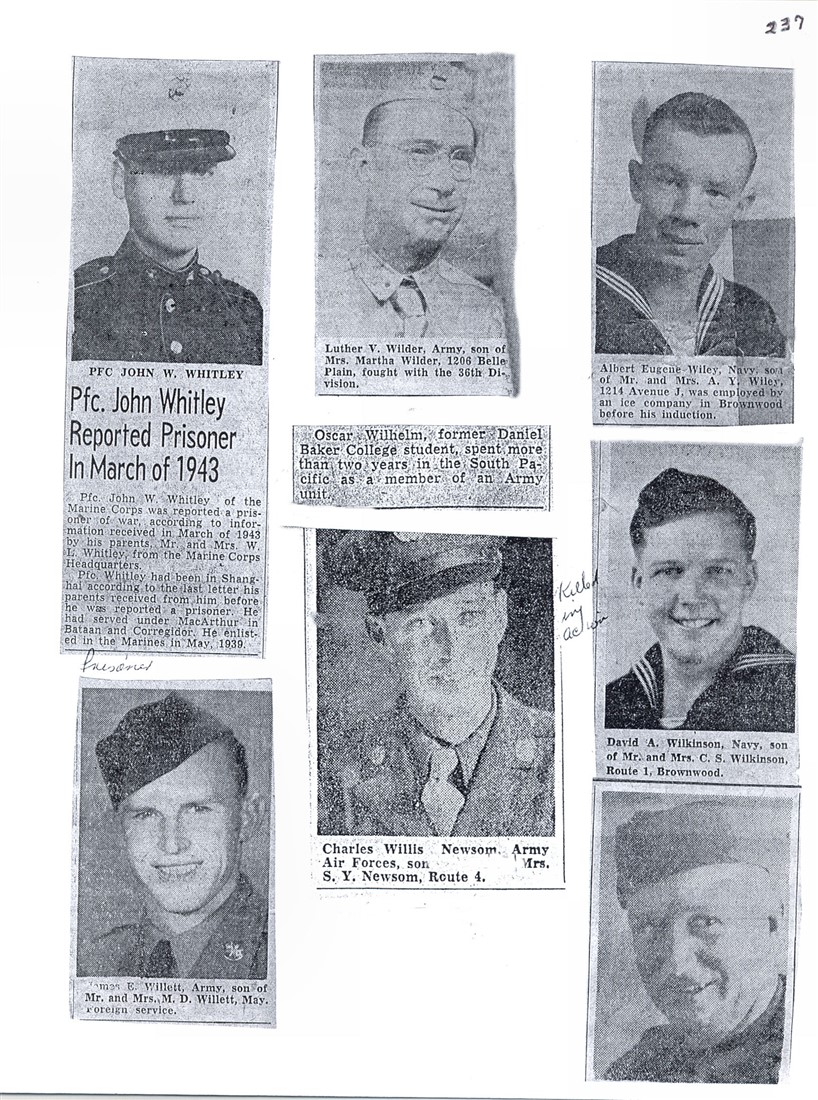 Welcome! Howdy and thank you for visiting my Veterans In World War 2 from the Brownwood Bulletin Clips web page. Doris Dickerson found the clips in the Lorene Bishop collection at the Brownwood Local History and Genealogy library in Brownwood, Texas. Doris then arranged the clips on the pages and printed them for a 122 double-sided page book [Cover]. Doris scanned every page to jpeg format, and then created the index with a spreadsheet listing 1,619 entries. Doris graciously donated her compilation to my Heart of Texas Veterans Memorial as an important part of my on going project to honor all of our Heart of Texas veterans.